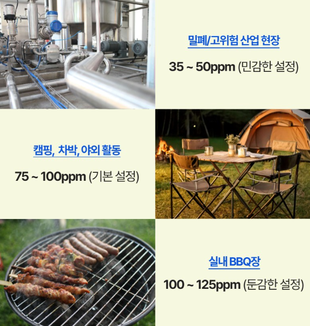 환기 없이 장시간 가스 불을 사용하거나 여러 화구를 동시에 사용할 때는 CO 농도가 높아질 수 있습니다.