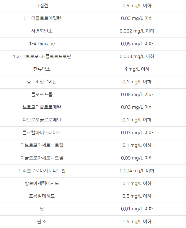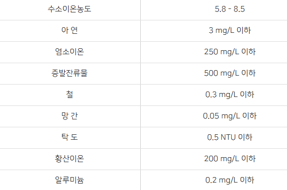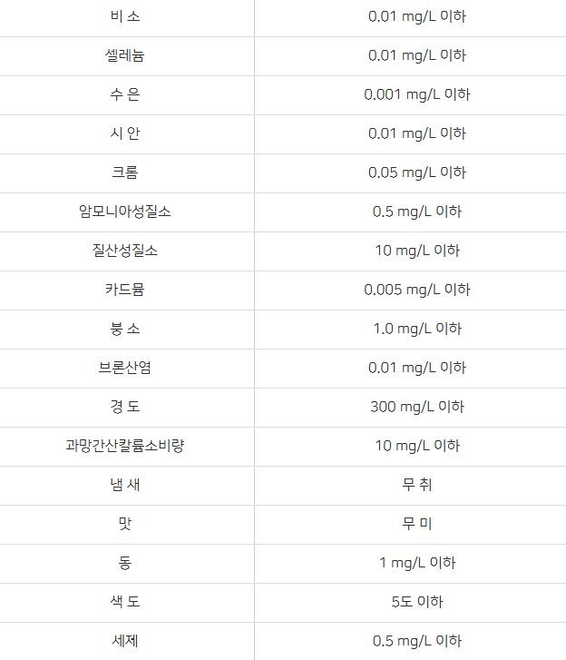 👉 예) 비소(Arsenic) 10 μg/L, 납(Lead) 10 μg/L 등 *위키백과